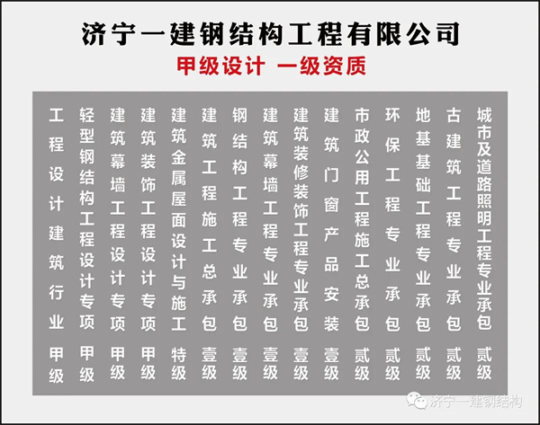 济宁pp电子官网钢结构工程有限公司,隶属中煤建设集团,集团注册资金1.0158亿元人民币,下设工程部、设计部、技术部、质检部、生产部、安全部。拥有钢结构施工、设计双甲资质、制造壹级资质,幕墙施工、设计双甲资质,装饰装修施工、设计双甲资质,建筑金属屋面设计与施工特级资质,门窗施工壹级资质,并具有对外承包施工资质和劳务输出资质等九项国家甲级资质。主要从事钢结构网架工程、管桁架工程、装配式轻钢别墅工程、膜结构工程及大型储罐工程的设计、生产与施工,公司相继承揽了机场航站楼、体育场馆、省级科技馆、大型厂房、高速路服务站、国家石油储库、加油站、储煤仓等各类工程,施工范围涉及全国三十多个省、市、自治区及直辖市,工程质量合格率100%,多年来荣获国内建筑界各类奖项100余个。